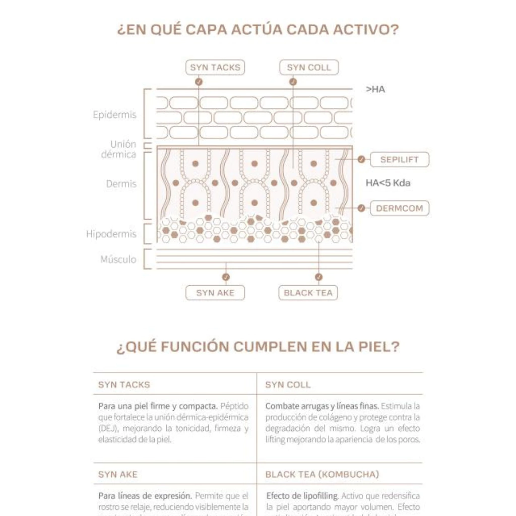 Redensifica la piel aportando mayor volumen. Efecto Anti- Glicación. Luminosidad de la piel.