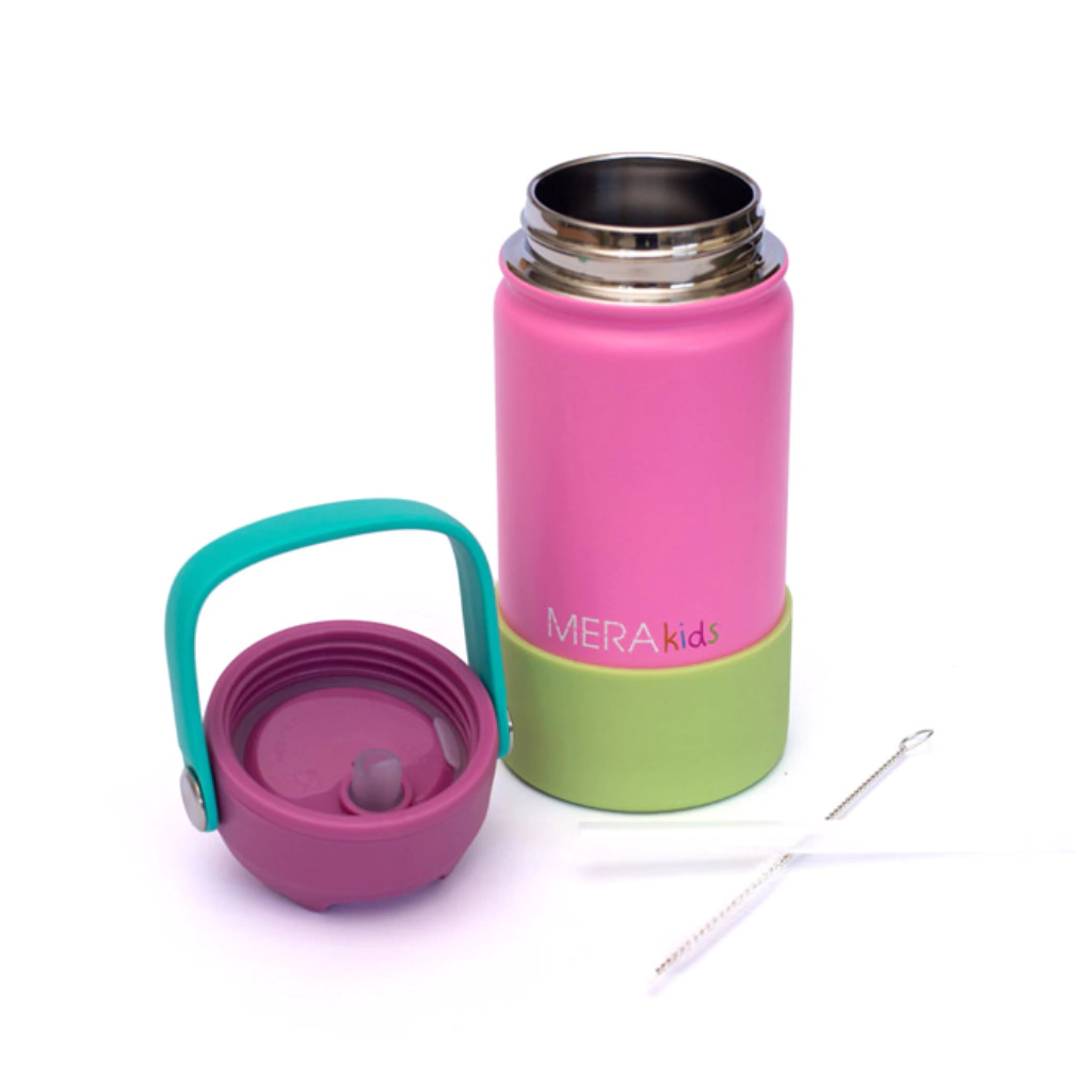 Botella MERAkids con capacidad de 420 ml, doble capa de acero inoxidable que la hace térmica y resistente. Hasta 18 horas fría y 6 horas caliente.