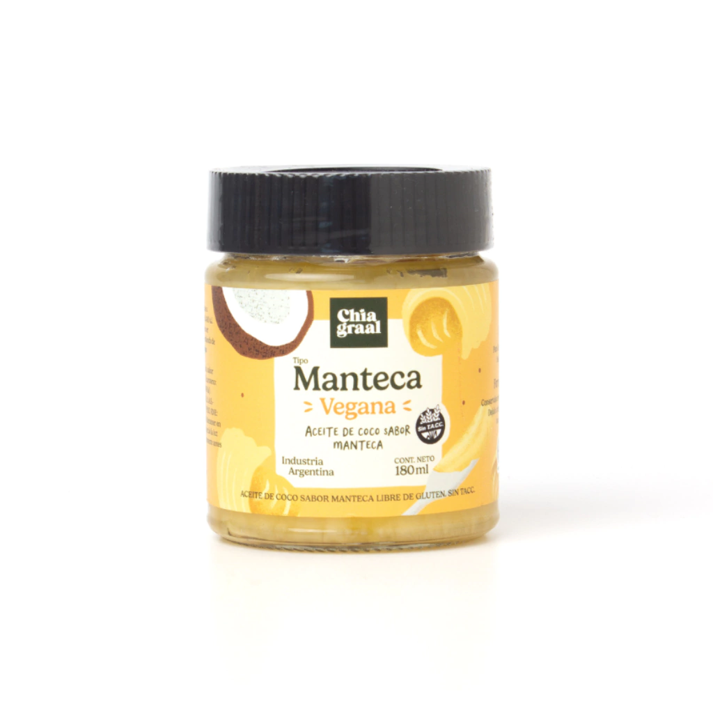 El aceite de coco Chiagraal® sabor manteca te brinda esa deliciosa sensación de volver a comer manteca pero sabiendo que es vegana, y no tiene grasas trans ni colesterol.
