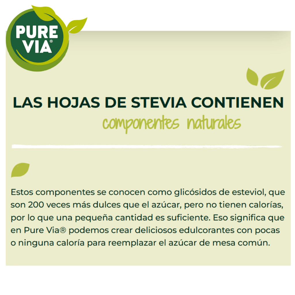 Estos componentes se conocen como glicósidos de esteviol, que son 200 veces más dulces que el azúcar, pero no tienen calorías, por lo que una pequeña cantidad es suficiente. Eso significa que en Pure Via® podemos crear deliciosos edulcorantes con pocas o ninguna caloría para reemplazar el azúcar de mesa común.